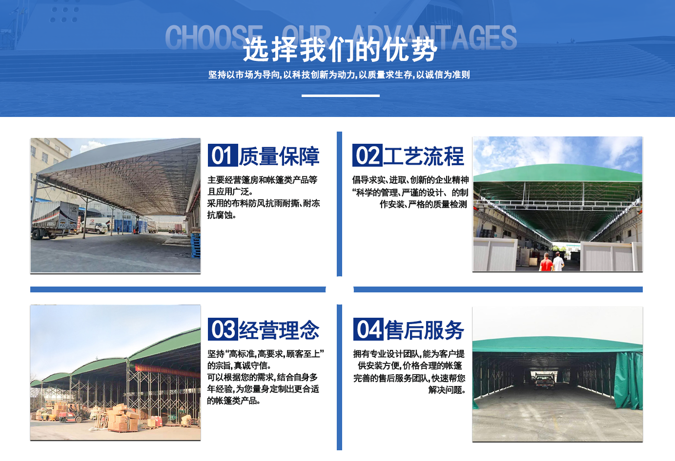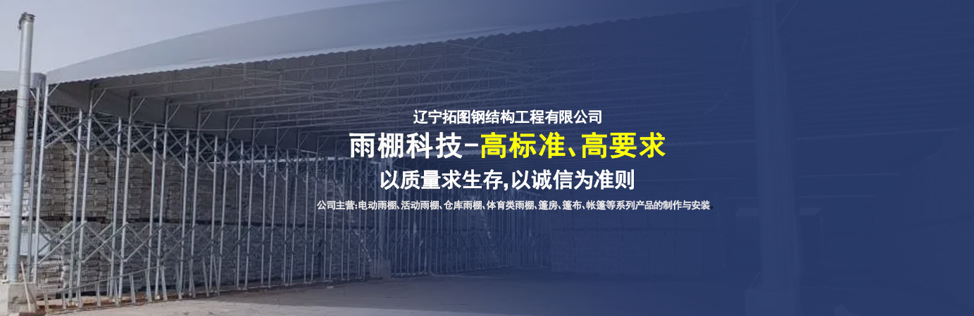 遼寧拓圖鋼結構工程有限公司是一家專業(yè)從事推拉篷設計、制作、安裝、使用、維修的綜合性公司。公司主營:電動雨棚、活動雨棚、倉庫雨棚、體育類雨棚、篷房、篷布、帳篷等系列產品的制作與安裝。 遼寧拓圖鋼結構工程有限公司堅持以市場為導向,以科技創(chuàng)新為動力,以質量求生存,以誠信為準則,倡導求實、進取、創(chuàng)新的企業(yè)精神?!翱茖W的管理、嚴謹的設計、 的制作安裝、嚴格的質量檢測、良好的后期服務成就企業(yè)的信譽,為您提供優(yōu)質服務。 遼寧拓圖鋼結構工程有限公司傾力于開發(fā)應用三維空間結構與新材料的結合,將廣告藝術視覺表現(xiàn)形式與張力膜材科學的結合,推出多彩推拉蓬,依靠先進的科學技術,將推拉蓬建筑表現(xiàn)形式無限延伸,立志走在建筑科學的前沿,引導建筑時尚潮流,我們的目標是使推拉蓬建筑在中國發(fā)展壯大?! ?nbsp; 遼寧拓圖鋼結構工程有限公司憑著極強的事業(yè)熱情和豐富的專業(yè)經驗以“勤勉進取、銳意創(chuàng)新、至誠至信”的精神使公司得到迅速健康發(fā)展,業(yè)務范圍遍及全國??茖W的管理、嚴謹的設計、高標準的制作安裝流程,嚴格把控產品質量,熱誠的售后服務是企業(yè)競爭力的源泉。 遼寧拓圖鋼結構工程有限公司人愿以最誠摯的態(tài)度,歡迎廣大客戶的蒞臨與溝通!愿為市場提供優(yōu)...